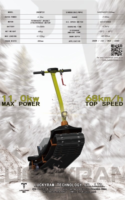 உயர்தர 4 கிலோவாட் மோட்டார்கள் மூலம் இயக்கப்பட்டு பெரிய திறன் கொண்ட லித்தியம் பேட்டரிகள் பொருத்தப்பட்டிருக்கும், இந்த ஸ்னோமொபைல் ஆழ்ந்த பனிக்கு ஏற்றது. அதன் ஸ்கேட்போர்டு ஸ்டீயரிங் அமைப்பு பனியில் சுவாரஸ்யமான வாகனம் ஓட்டுவதை உறுதி செய்கிறது.