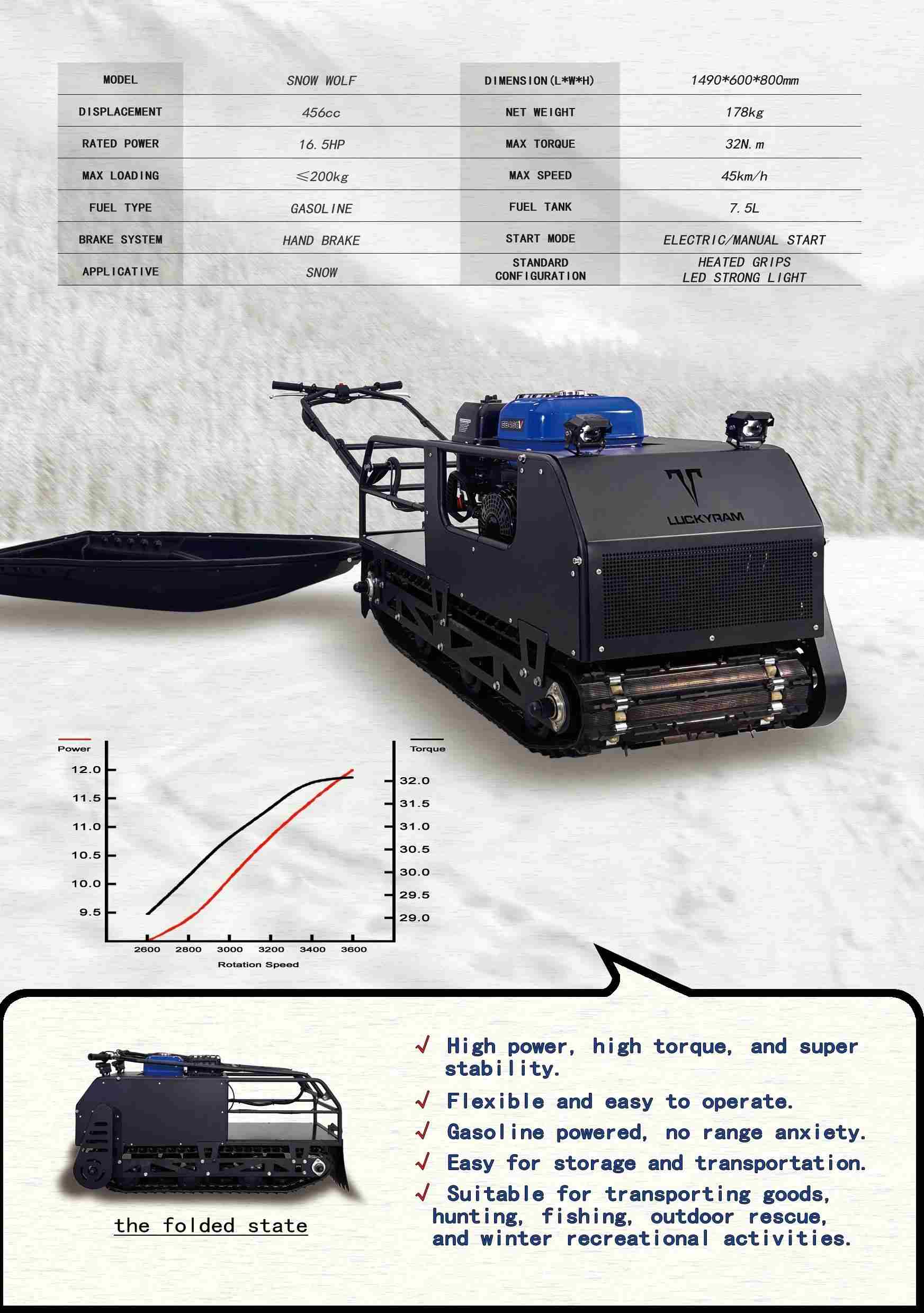 உயர்தர 456 சிசி எஞ்சின் மூலம் இயக்கப்பட்டு பெரிய ஸ்லெட் பொருத்தப்பட்ட இந்த வாகனம் ஆழ்ந்த பனிக்கு ஏற்றது. அதன் சக்திவாய்ந்த இயந்திரம் பனியில் சுவாரஸ்யமான வாகனம் ஓட்டுவதை உறுதி செய்கிறது.